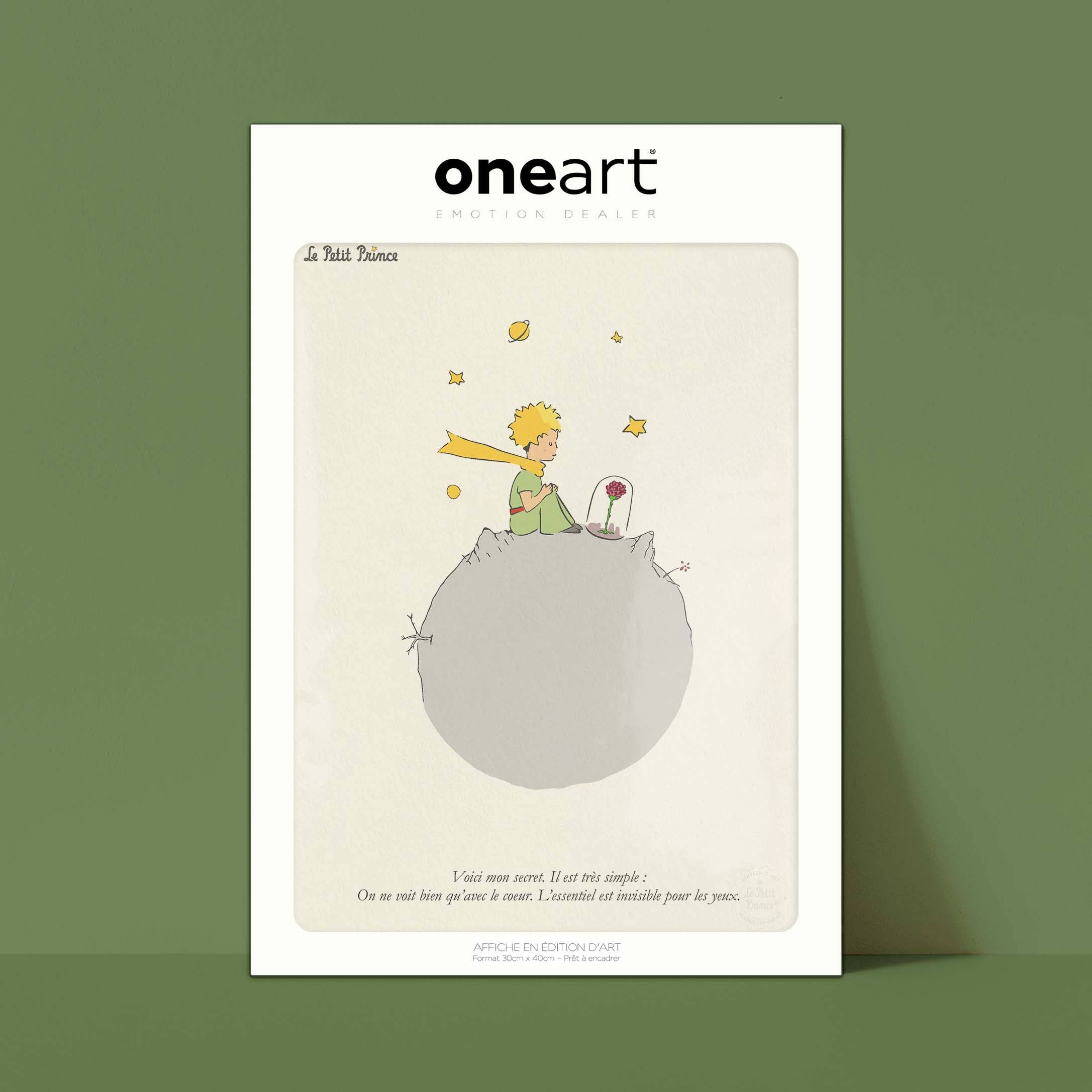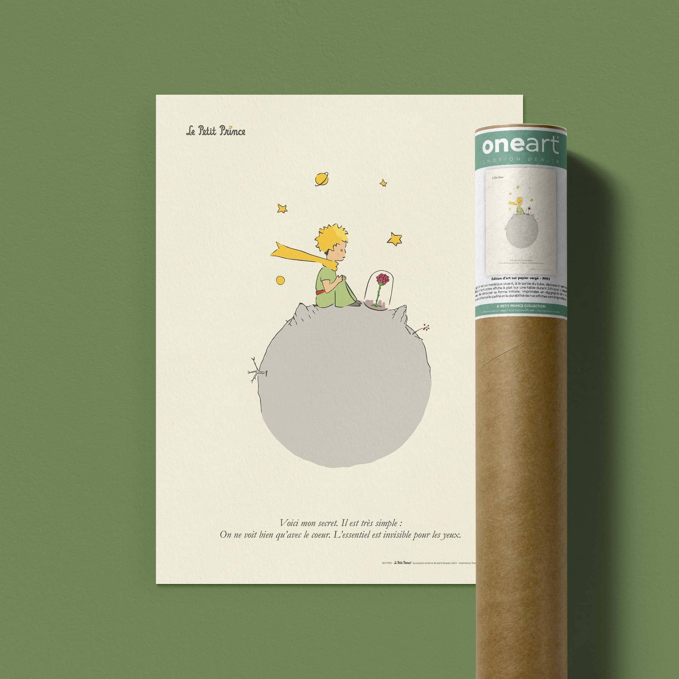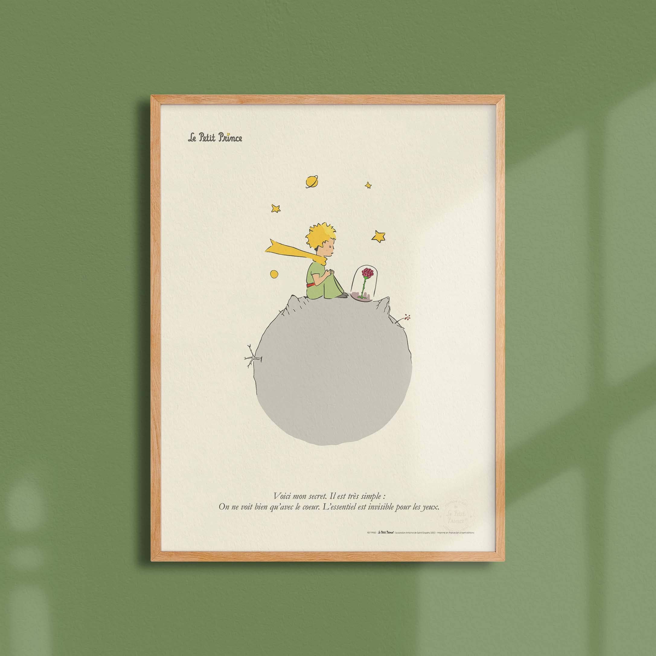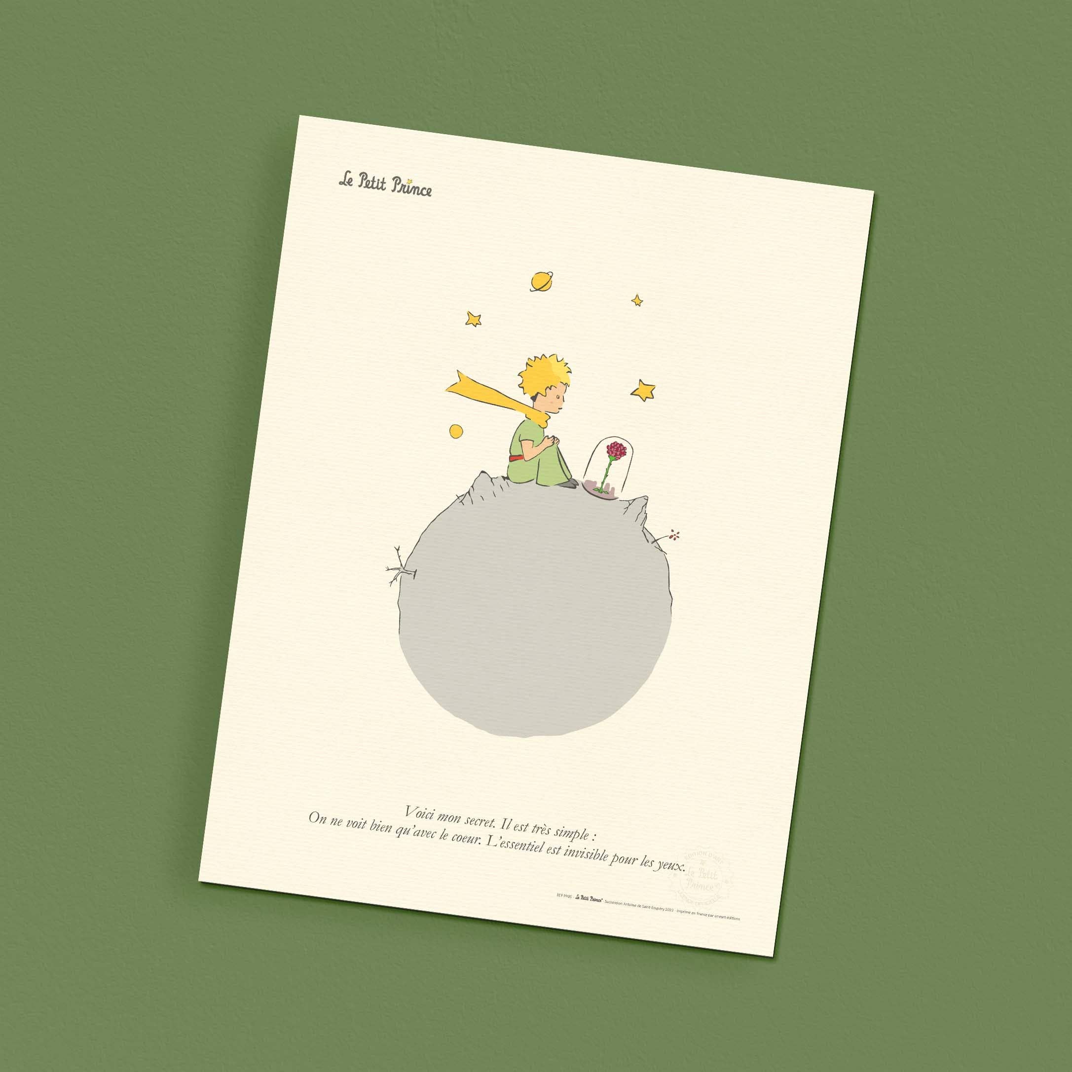 This delicate illustration is accompanied by the famous quote: "Here is my secret. It is very simple: One sees clearly only with the heart. What is essential is invisible to the eyes." This official poster is published under Le Petit Prince® license. It is a reproduction of an illustration from the work of Antoine de Saint-Exupéry. Each poster bears, at the bottom right, a blind stamp certifying its authenticity. Le Petit Prince®