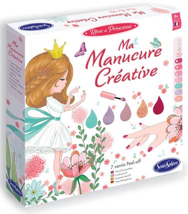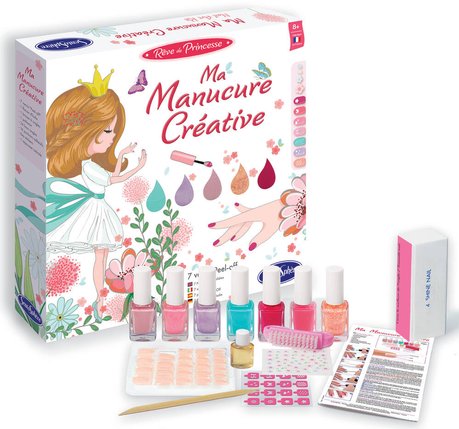 A kit for creating princess hands: children can paint their nails in 7 different colors to give themselves a pretty manicure. The polish comes off very easily, in a few seconds, by lifting the layer of color with their other hand. Their nails will immediately look natural again. Very comprehensive, this set also includes a buffer to make nails naturally shine and flower stencils to create a professional-style manicure!